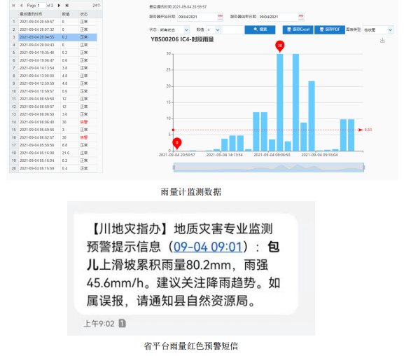 2021年9月4日,四川省宜宾市叙州区阳荷村同心组包儿上滑坡发生 滑坡险情,该监测点雨量计(编号:511521010076L3YL01)分别于 2021-09-04 06:52:57 和 2021-09-04 08:06:40 监测到小时降雨达到 30mm 并触发现场声 光预警广播报警,省平台于 09:01 发出雨量红色预警短信,该监测点日降 雨量达 114.8mm,见下图:
