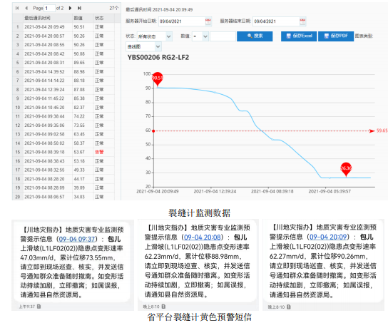 该监测点 1 号裂缝计(编号:511521010076L3LF01)监测滑坡后缘偏 右位置,未见有明显变化。2 号裂缝计(编号:511521010076L3LF02)监 测滑坡后缘靠左位置,于 2021-09-04 08:06:57 监测到滑坡开始变形,并于 2021-09-04 08:39:18 达到现场速率变化阈值触发现场声光预警广播报警, 省平台于 09:37 首次发出裂缝计黄色预警短信。经现场核实情况后,为防 止该滑坡持续变形,当地政府立即组织 6 户 9 名群众撤离危险区域,截止 2021-09-04 20:08:42 监测数据来看,该滑坡趋于稳定未见持续变形,详见下图。