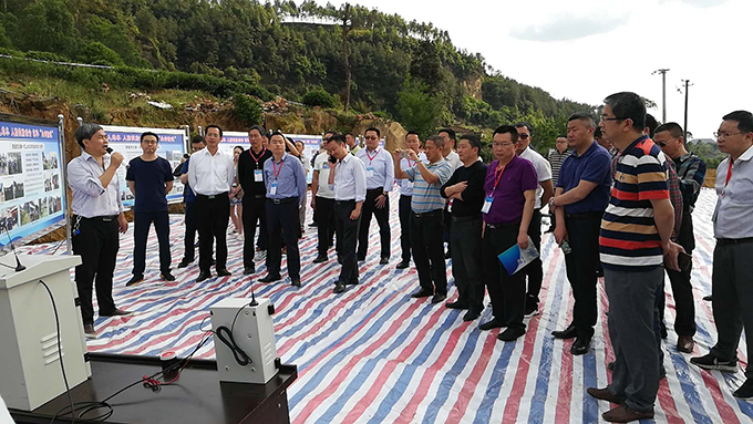 我公司总经理(左1向代表们、详细介绍成功监测预警一匹山崩塌灾害的过程